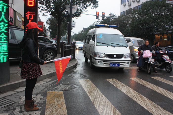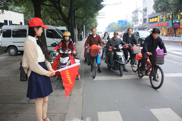 我院交通志愿者周旭青在進行文明勸導(dǎo)