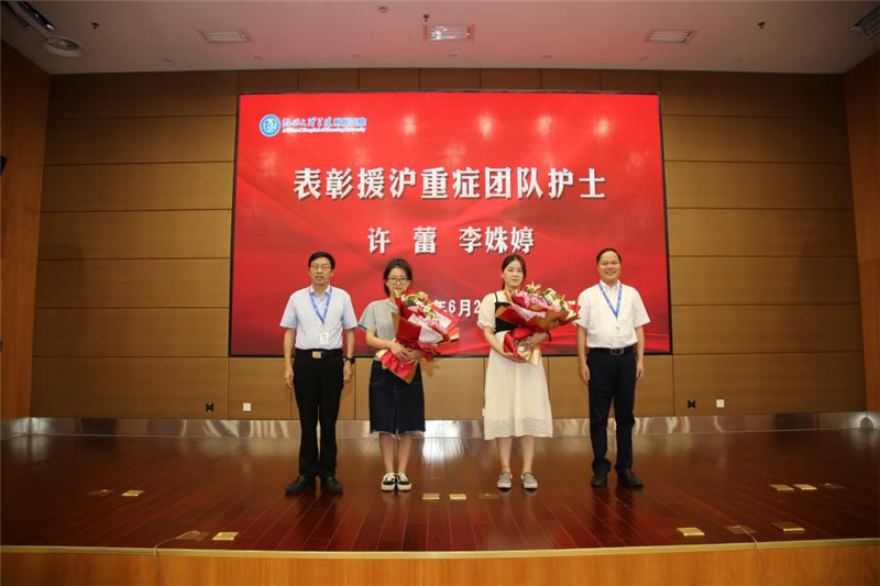 會上,首先表彰了援滬重癥團隊2位護(hù)士許蕾、李姝婷同志。援滬期間,她們圓滿完成重癥醫(yī)療任務(wù),交出了“零感染”的合格答卷,獲得了浙江省援滬重癥醫(yī)療隊和當(dāng)?shù)蒯t(yī)院的充分肯定。院黨委書記張偉陽和院長夏瑞明為兩位護(hù)士送上了鮮花表示感謝。